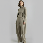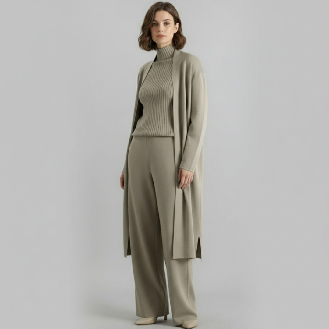 Balanced Silhouette: The softly structured top, flowing trousers, and long outer layer work together to create a flattering and elongated profile.