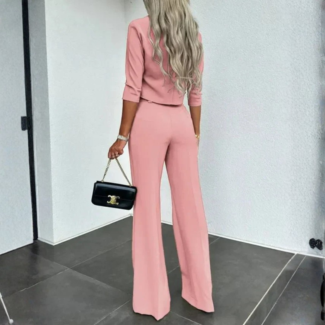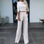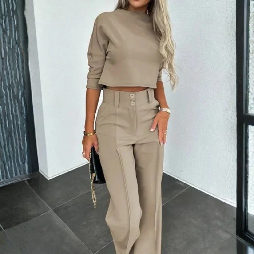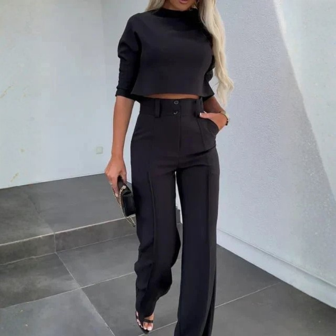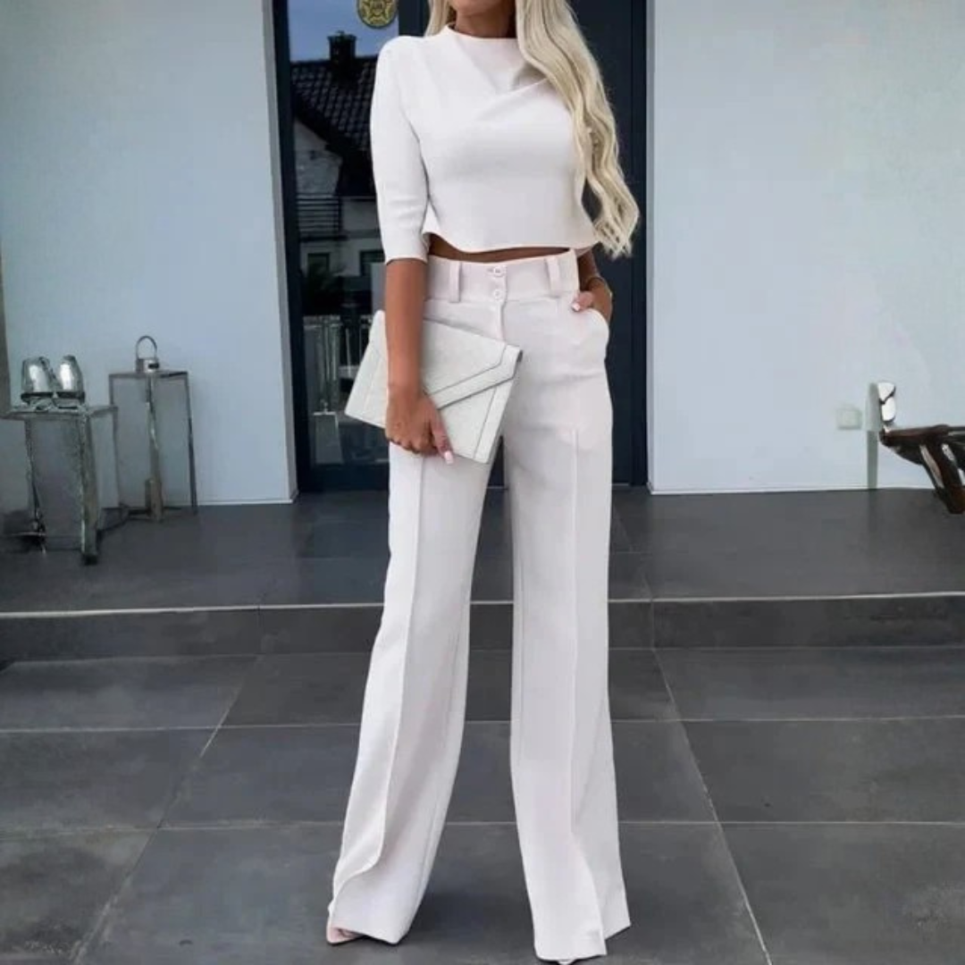 Evangeline | Women Spring Co-ord Set Cropped Top Wide Leg Trousers High Waist Belt Loops Side Pockets