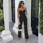 This strapless top and flared trousers set delivers a refined and confident look designed for spring and warm-season styling. The sculpted top and flowing trousers create a polished silhouette ideal for city outings, social gatherings, or elevated daytime occasions. Its coordinated design feels elegant while remaining light and comfortable for all-day wear.