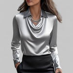 This women’s satin blouse is designed around shape and drape, making it easy to style for smarter outfits without needing extra detail. The collared neckline keeps the top line structured, while the cowl neckline creates a soft draped front that sits neatly when worn tucked into trousers or a skirt. With long sleeves and a smooth satin finish, it pairs well with tailored pieces for workdays, dinners, and event-ready looks.