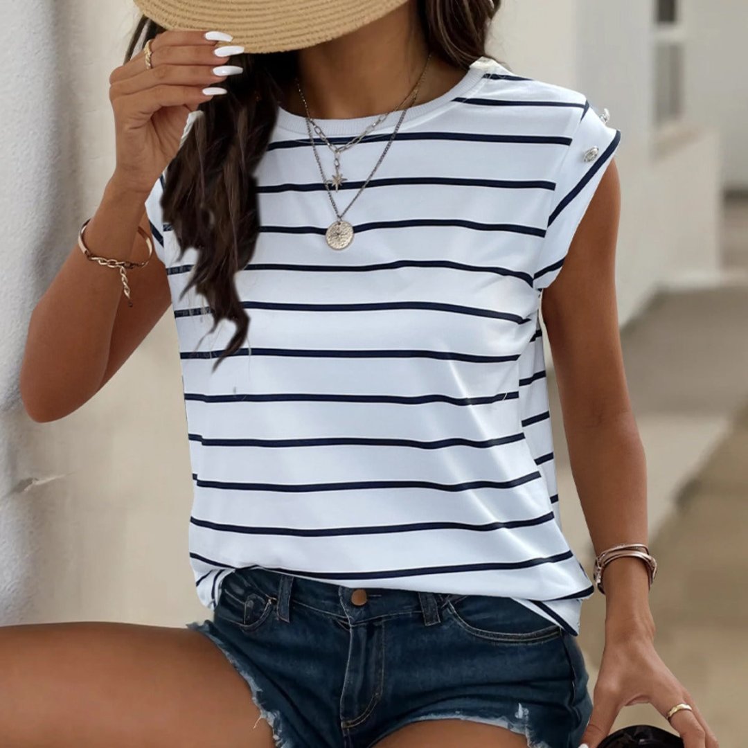 Emily | Women Summer Striped T-shirt Sleeveless Crew Neck Shoulder Buttons