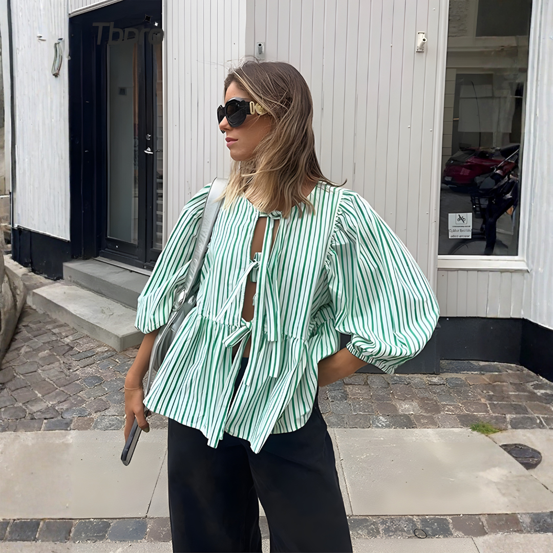Sophie | Women Spring Striped Blouse Tie-Front Puff Sleeves Gathered Waist Peplum Hem