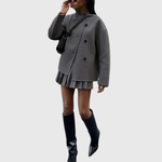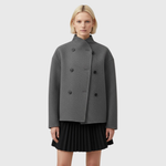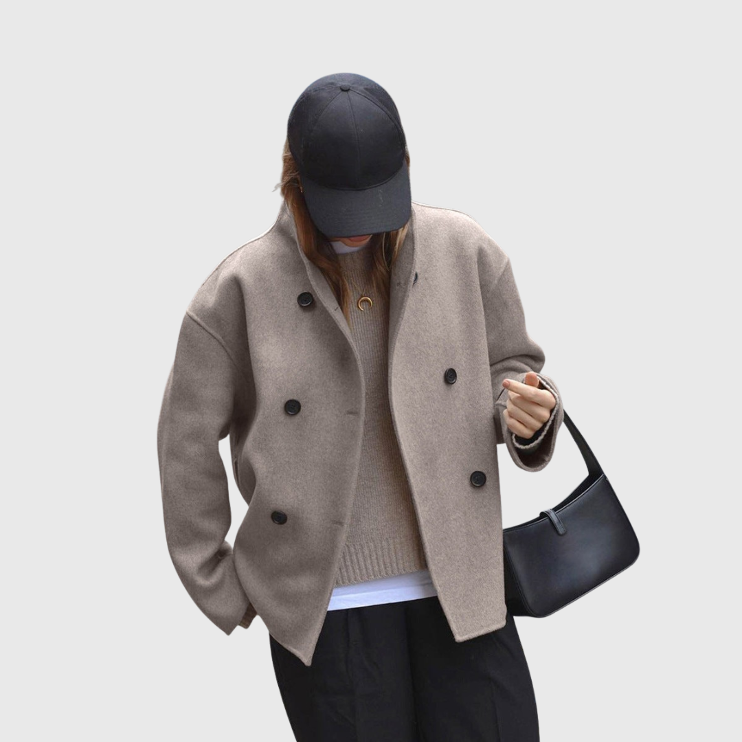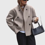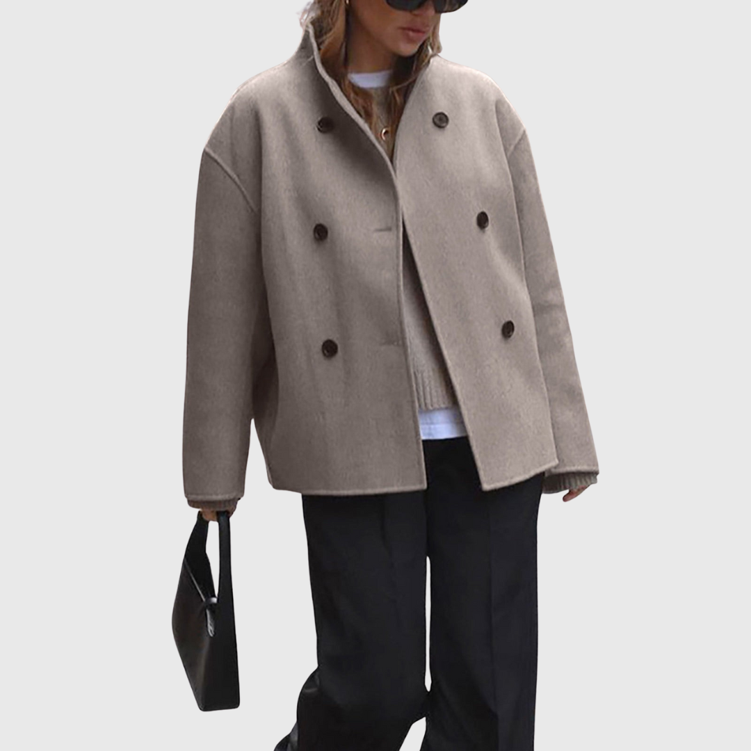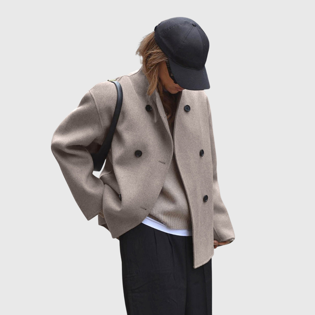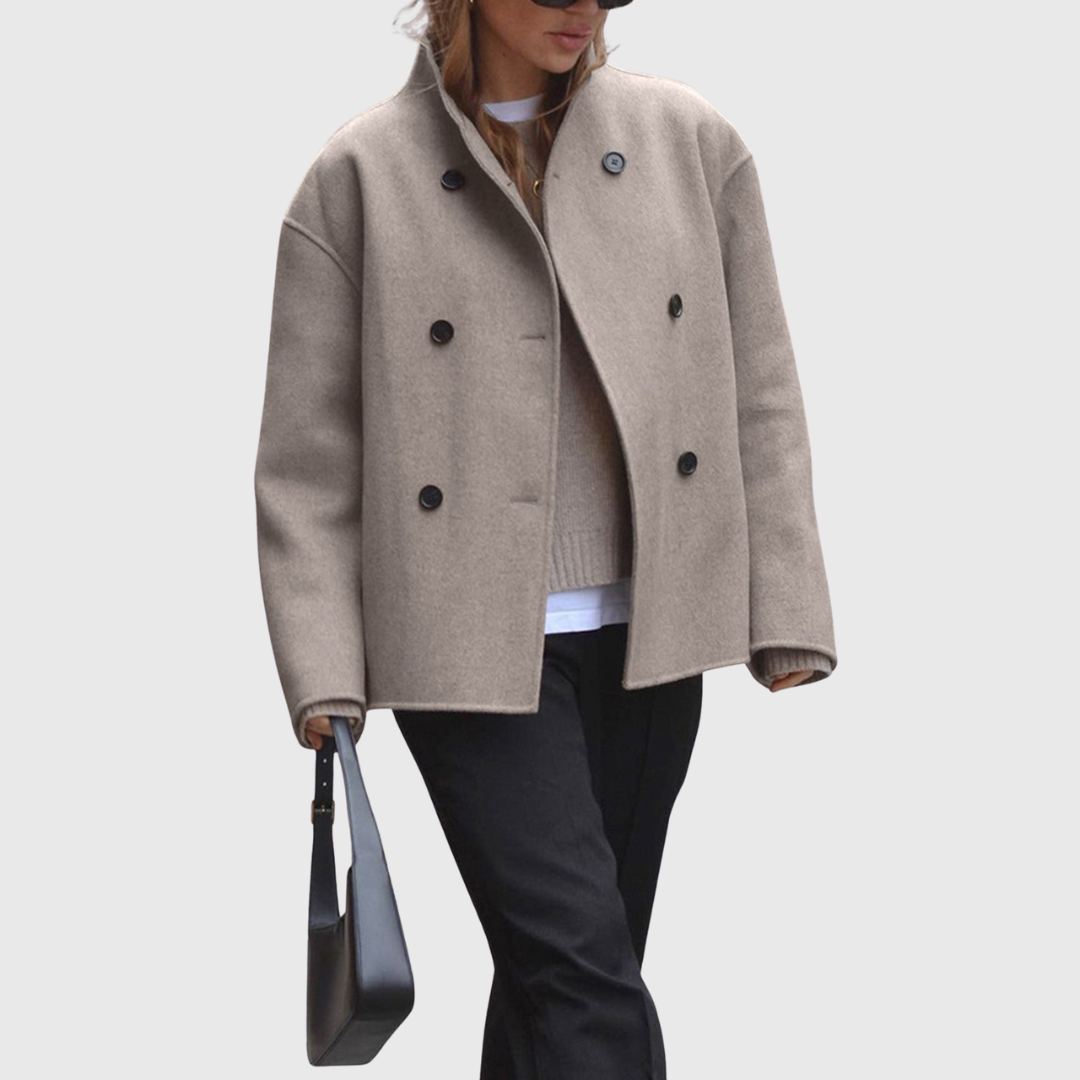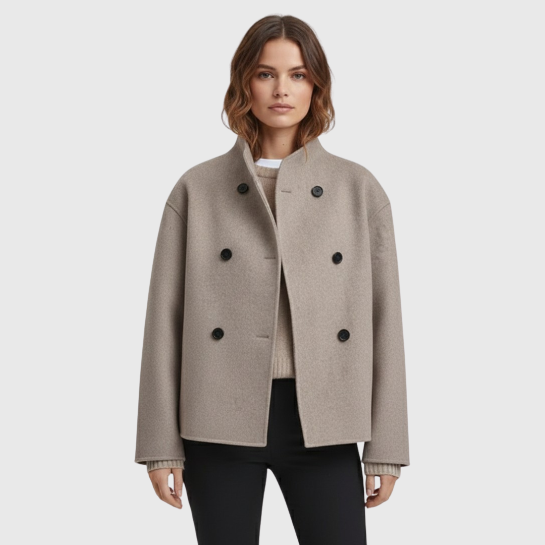 Dieser doppelt geknöpfte Damenmantel verfügt über eine strukturierte Silhouette in kurzer Länge mit einer klaren Vorderseite und einer symmetrischen Knopfleiste. Der gerade Schnitt und die definierten Schultern sorgen für ein ausgewogenes Profil, das sich sowohl für den Alltag als auch für elegante Winteroutfits eignet.
