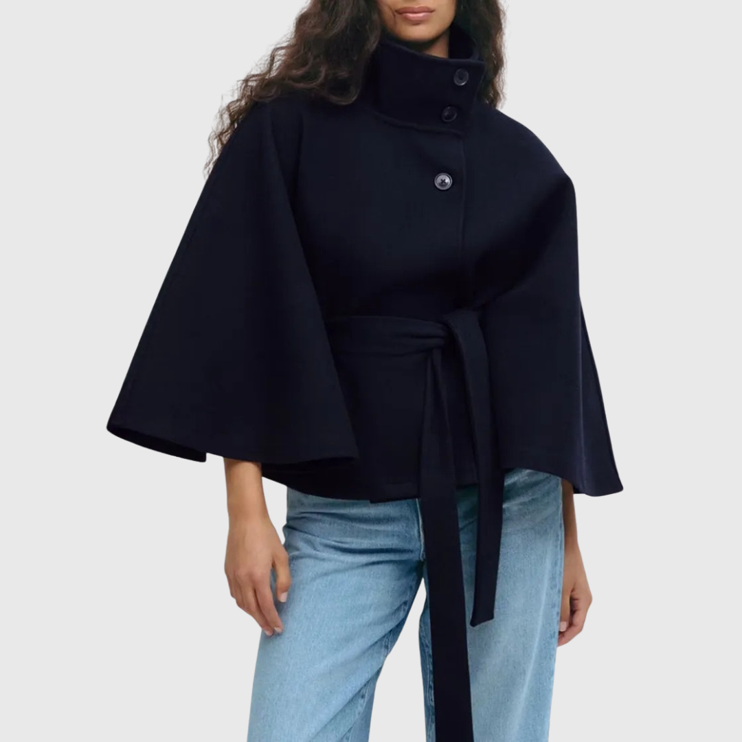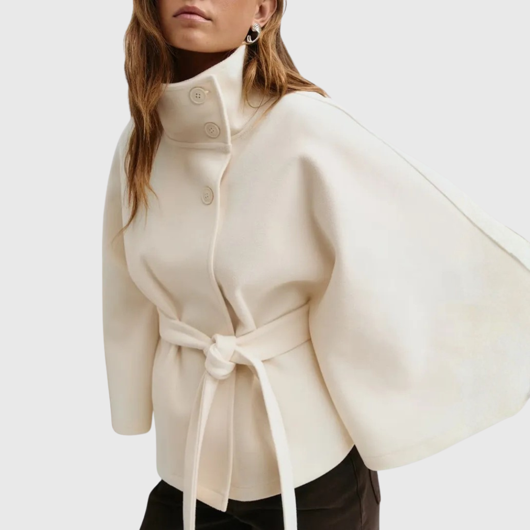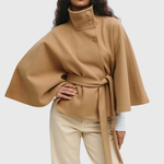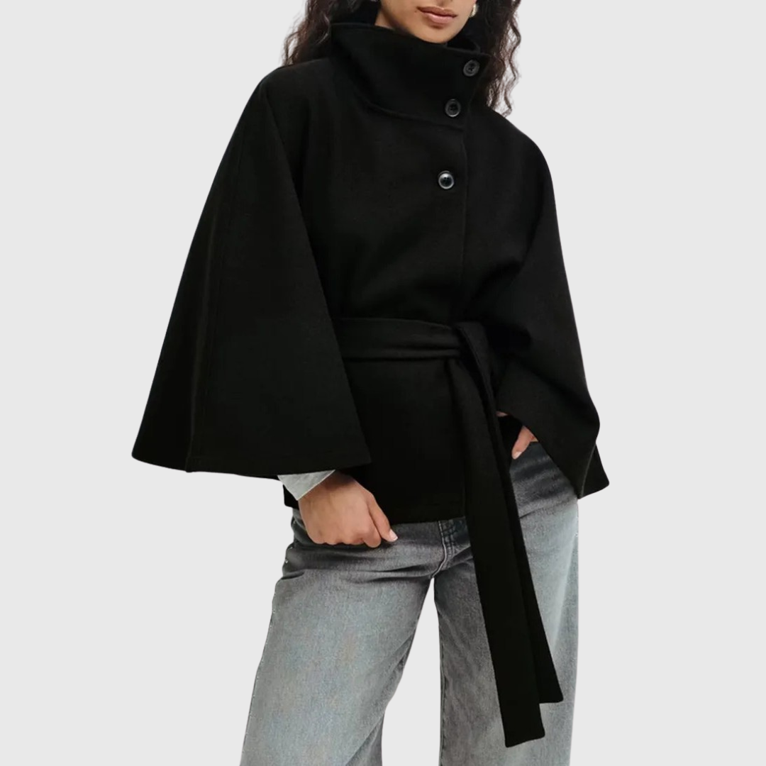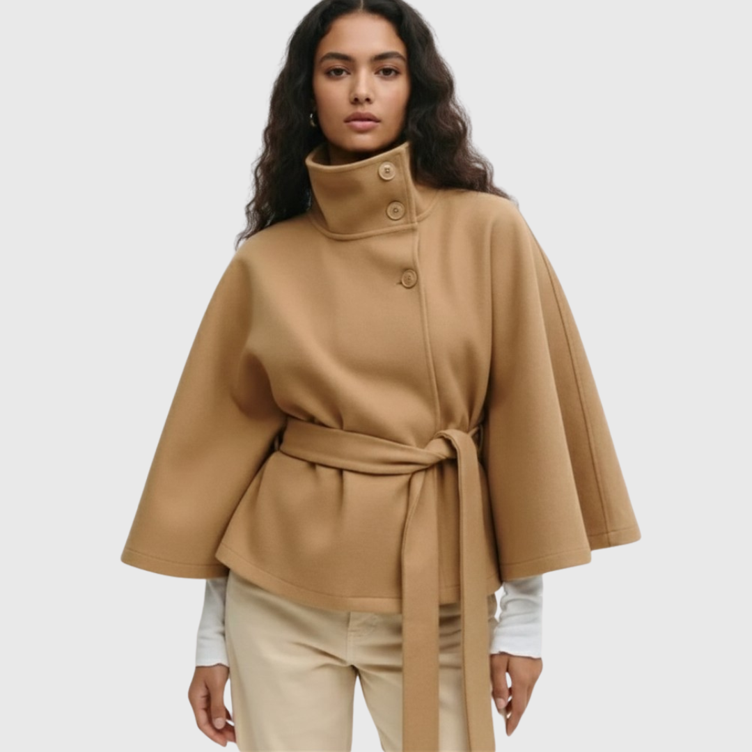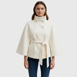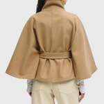 Dieser kurze Damenmantel zeichnet sich durch eine Cape-Silhouette mit hohem Trichterkragen, weiten Ärmeln und einem Bindegürtel aus, der die Taille betont. Die A-Linien-Form und die verkürzte Länge sorgen für ausgewogene Proportionen und machen den Mantel ideal zum Layering über Alltagsoutfits in der kühleren Jahreszeit.
