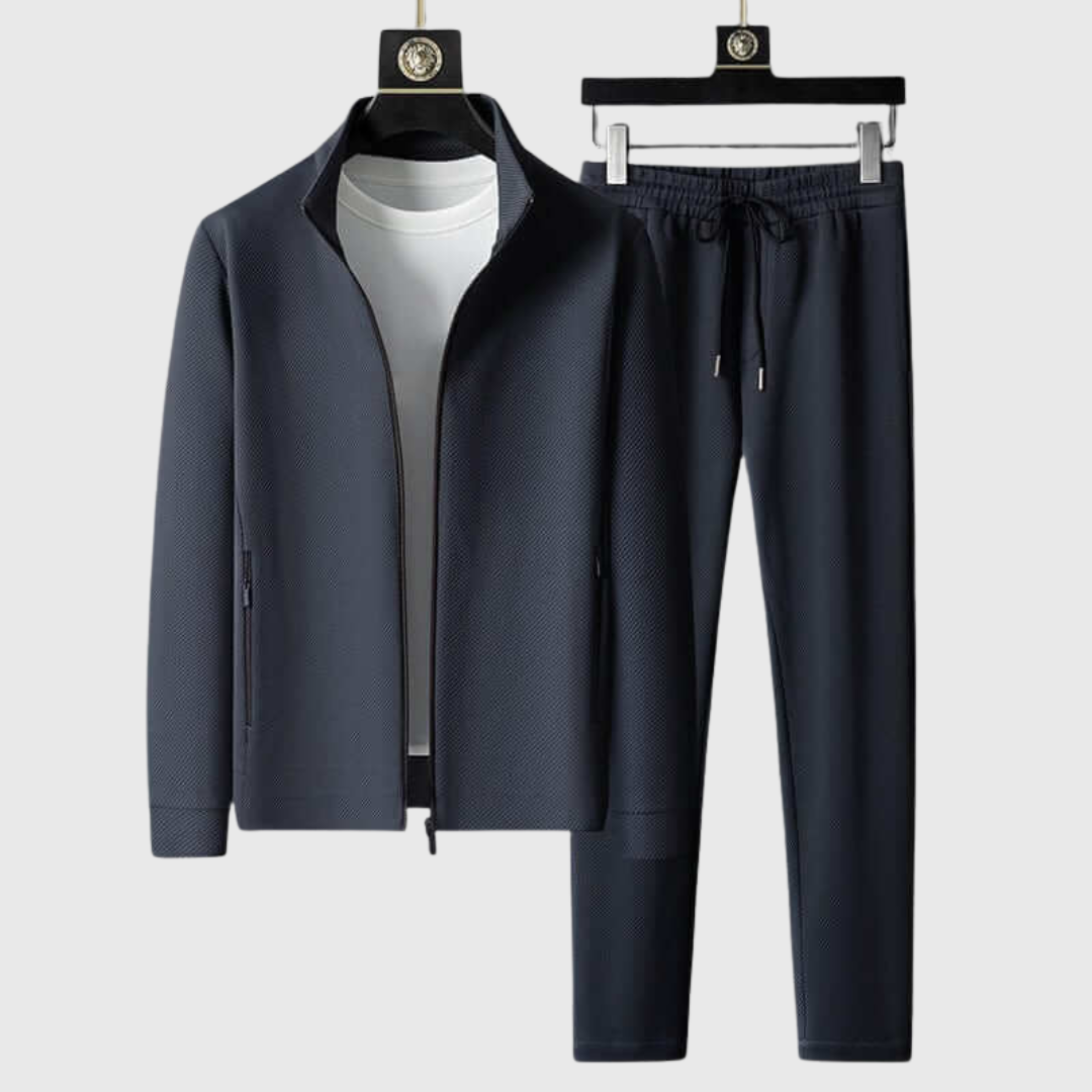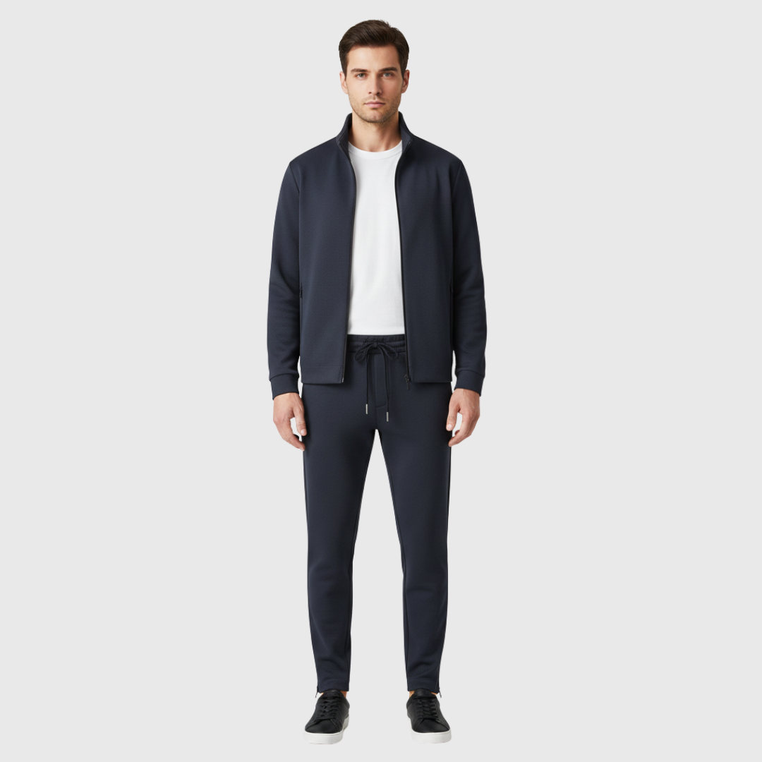 Dieser Herren-Zweiteiler besteht aus einer abgestimmten Jacke und Hose mit einer schlanken, minimalistischen Silhouette. Die Jacke verfügt über einen durchgehenden Reissverschluss, während die Hose eine schmal zulaufende Beinform mit sauberem Abschluss aufweist. Das koordinierte Set bietet ein ausgewogenes und vielseitiges Erscheinungsbild für den täglichen Freizeitbereich.