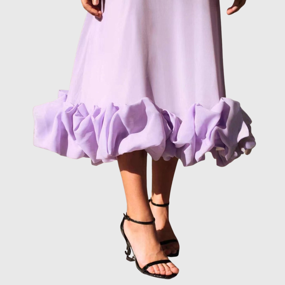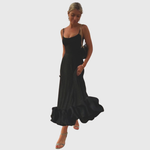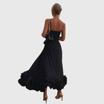 Dieses Maxi-Kleid verfügt über schmale Spaghettiträger und ein glatt gearbeitetes, figurbetontes Oberteil, das in einen weit ausgestellten Rock übergeht. Das bodenlange Design wird durch einen gerafften Volantsaum abgeschlossen, der dem unteren Bereich zusätzliches Volumen verleiht. Die klare Oberfläche und die definierte Struktur machen das Kleid geeignet für formelle Anlässe und Abendveranstaltungen.