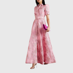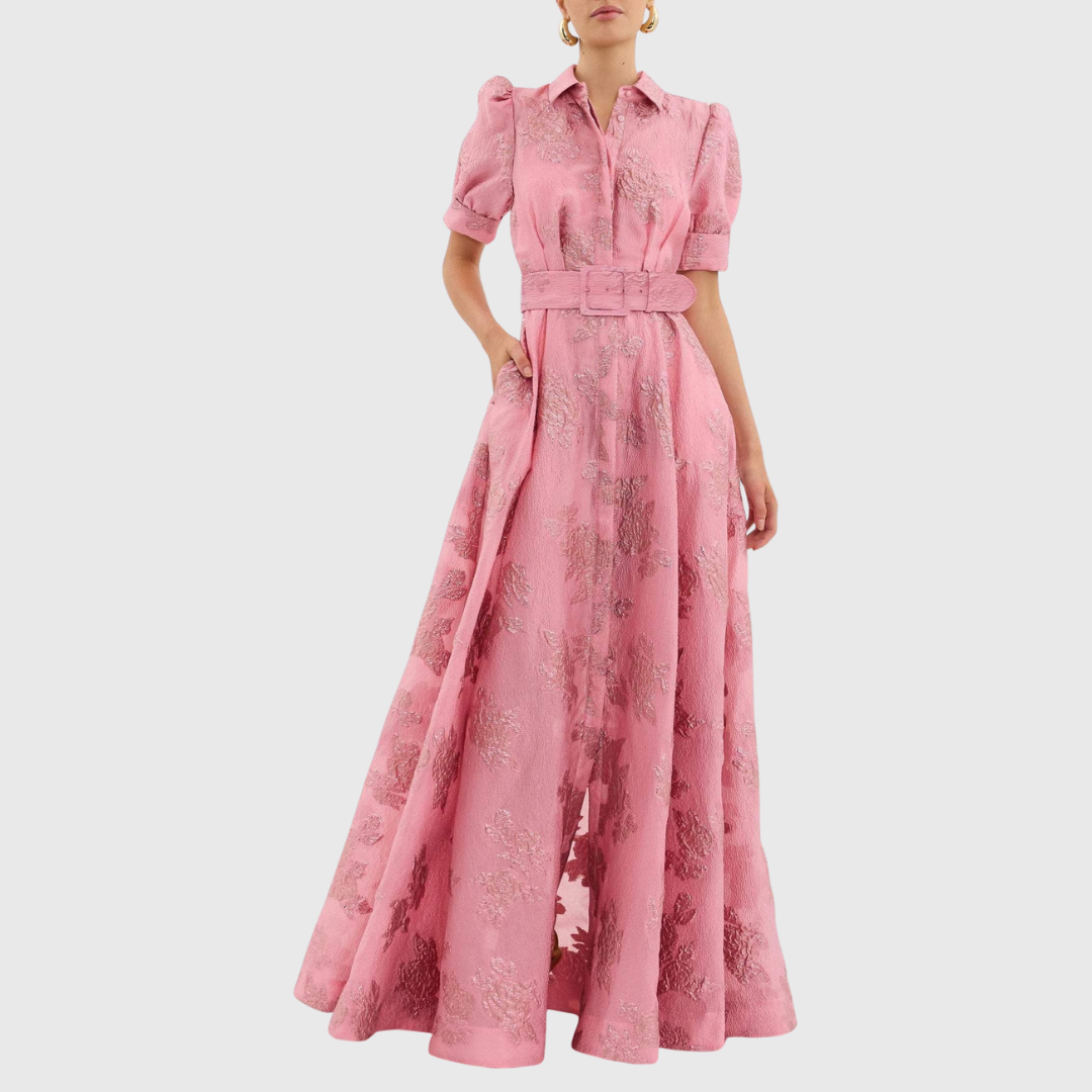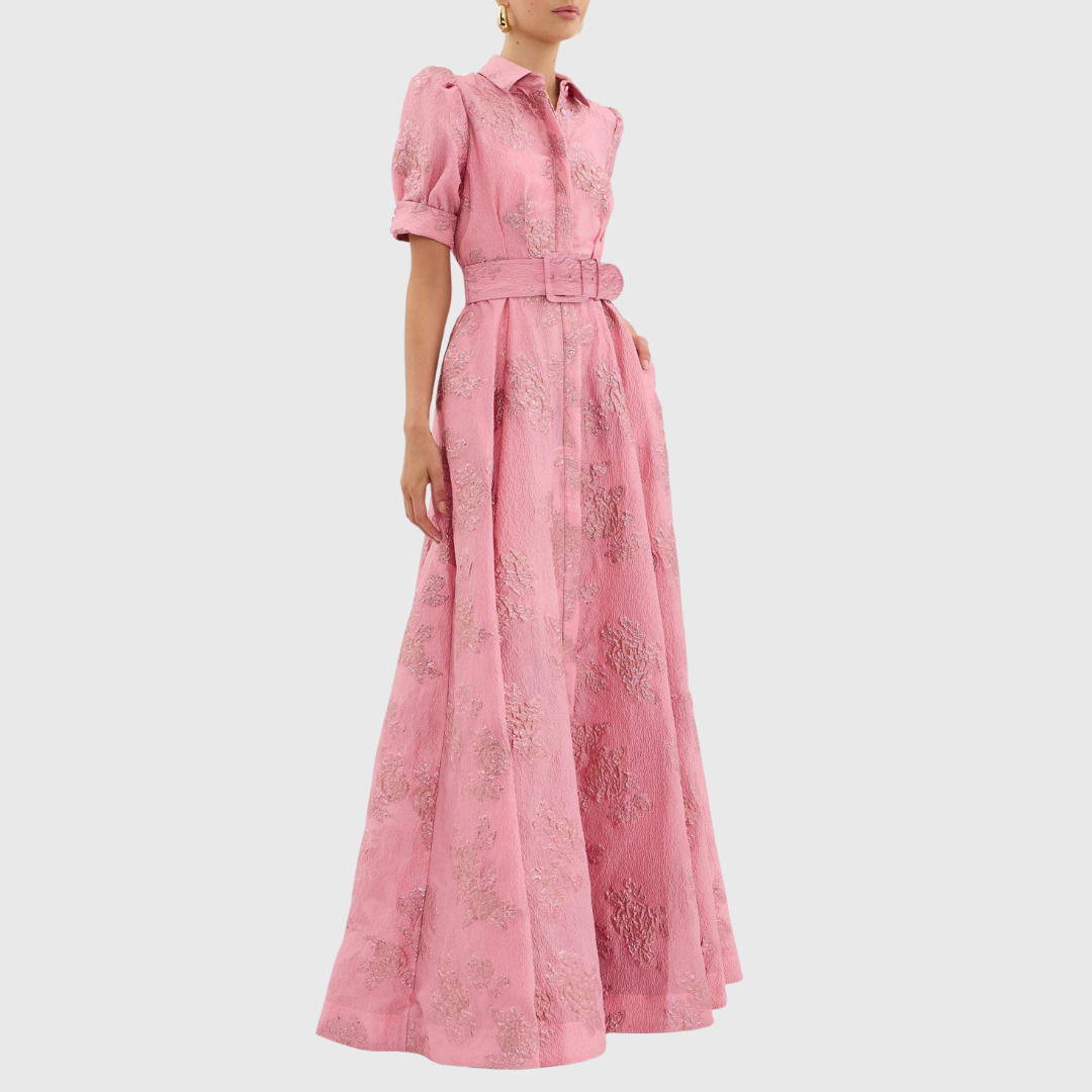 Dieses Maxi-Kleid verfügt über kurze Ärmel, eine klar definierte Taille mit passendem Gürtel sowie eine bodenlange Silhouette. Das Design kombiniert einen strukturierten oberen Bereich mit einem fliessenden Rockteil und eignet sich für formelle Anlässe sowie abgestimmte Gruppenveranstaltungen. Der Aufbau unterstützt ein ausgewogenes und gepflegtes Erscheinungsbild.