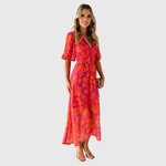Dieses Damen-Midikleid ist mit einem durchgehenden floralen Muster gestaltet und verfügt über einen V-Ausschnitt sowie kurze Puffärmel. Die Silhouette wird durch eine definierte Taille geformt, während der Rock unter das Knie fällt und eine ausgewogene, saisonale Linienführung schafft. Das Kleid eignet sich für warme Wetterbedingungen und legere Tagesanlässe.