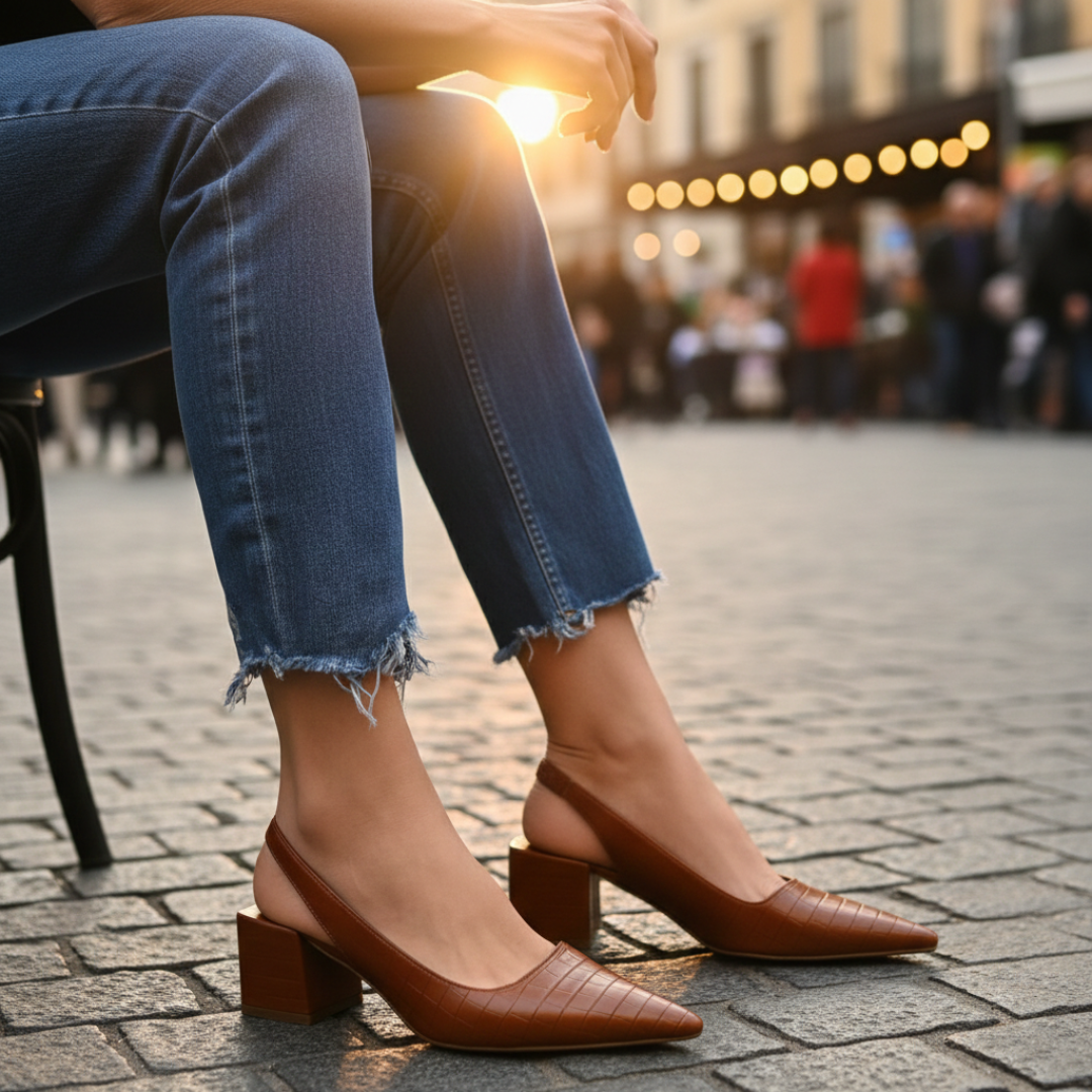 These pointed toe block heel shoes bring a refined and modern edge to warm-season outfits, offering a perfect balance between elegance and everyday wearability. Designed for summer styling, they complement both casual looks and more polished outfits with ease, making them ideal for city days and evening plans.