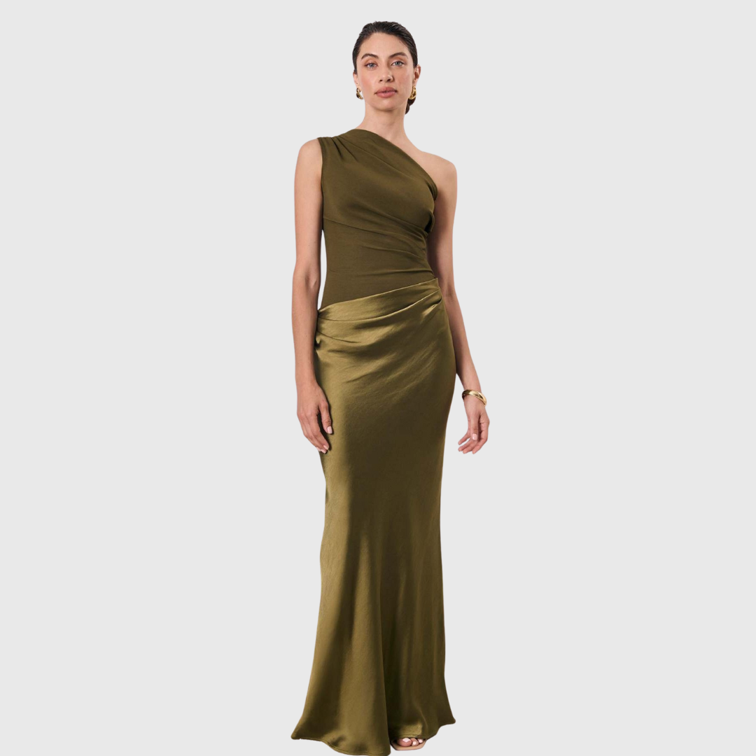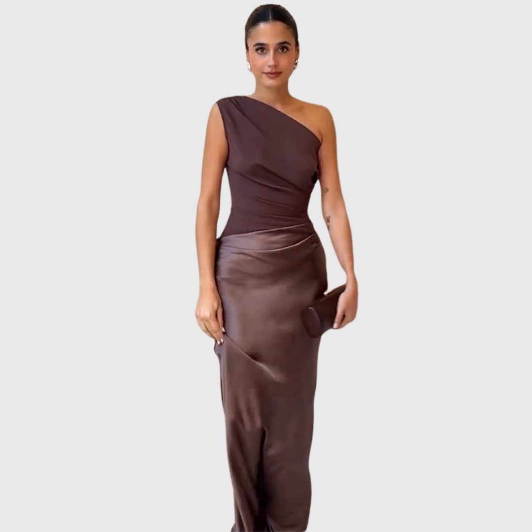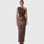 Dieses Maxikleid besticht durch ein einseitiges Design mit einer klaren, skulptierten Linie. Der enganliegende obere Teil geht in einen geraden, bodenlangen Rock über, wodurch eine ausgewogene und stromlinienförmige Erscheinung entsteht. Der asymmetrische Ausschnitt sorgt für visuelles Interesse und macht dieses Kleid ideal für formelle Anlässe und Abendveranstaltungen.