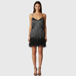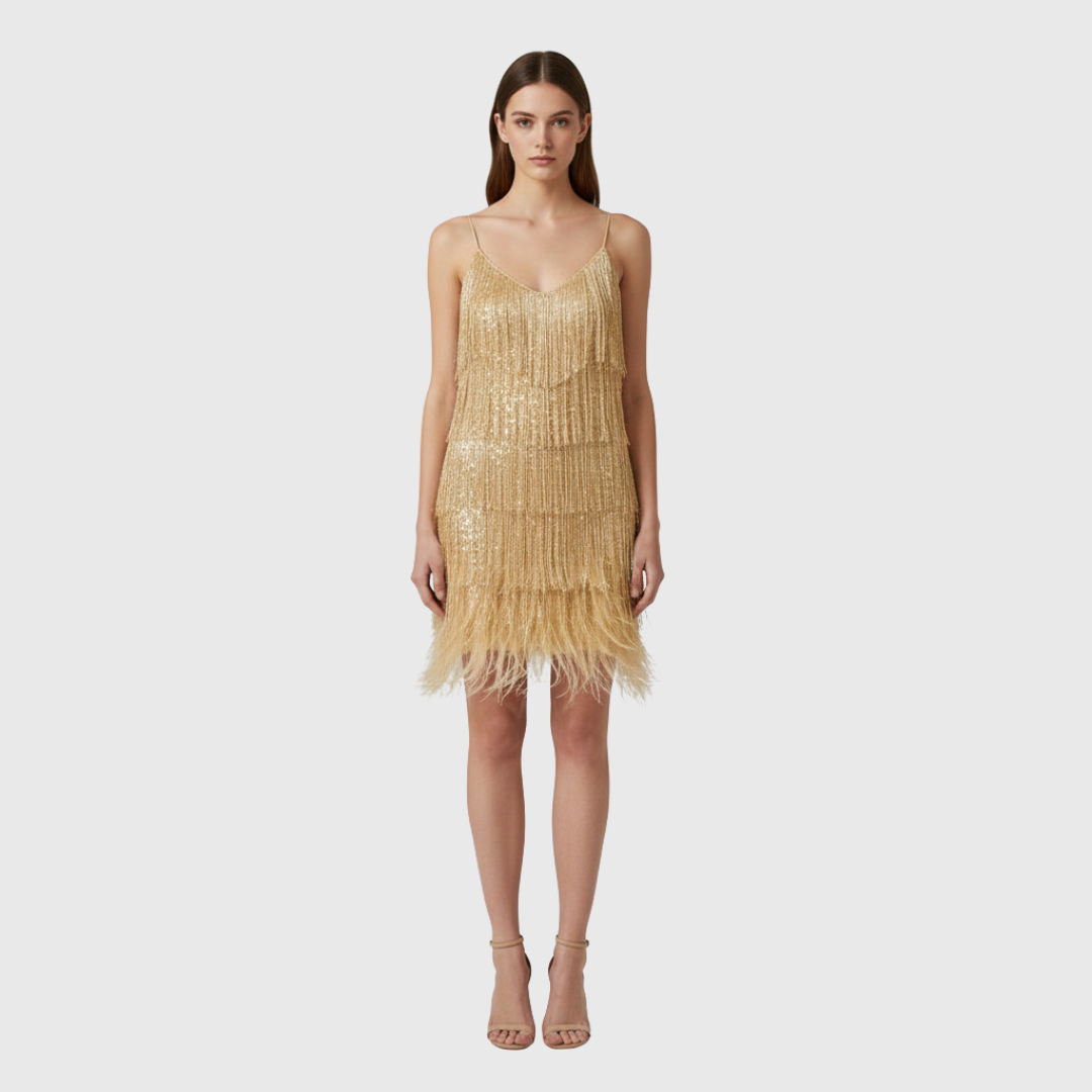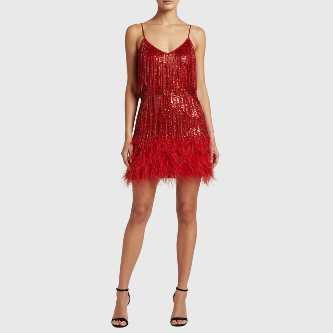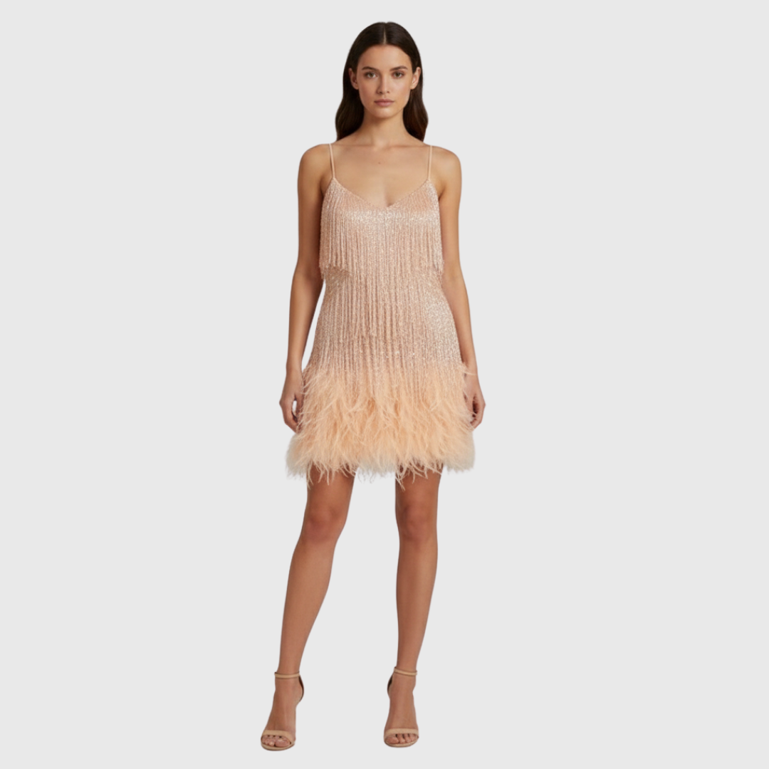 Dieses Minikleid besticht durch aufwendige Fransenfedern und Paillettenverzierungen, die einen dynamischen Look schaffen und das Licht bei jedem Schritt einfangen. Mit seiner figurbetonten Silhouette betont es deine Kurven und sorgt für einen glamourösen Look bei Abschlussbällen, formellen Veranstaltungen und Nächten in der Stadt.